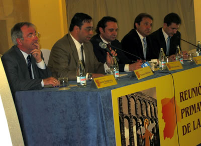 De izquierda a derecha: D. Javier Santamaría Herranz (Presidente de la Diputación Provincial de Segovia), D. Venancio Martínez Suárez (Presidente de la SCCALP), D. Pedro Arahuetes García (Alcalde de Segovia), D. Juan Luis Gordo Pérez (Subdelegado del Gobierno en Segovia) y D. Santiago David Calleja López (Comité Organizador de la Reunión)